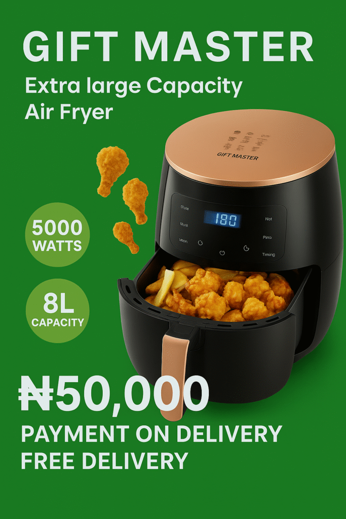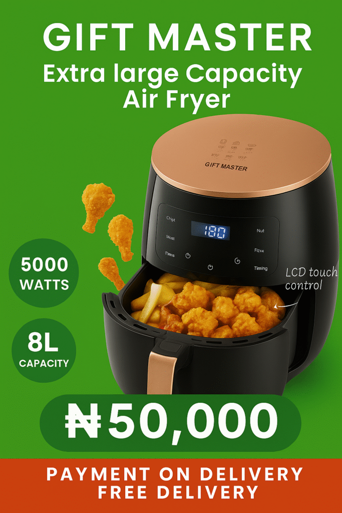 Introducing the Gift Master Extra Large Capacity Air Fryer, the perfect kitchen companion designed to make every day cooking healthier, faster, and more convenient. With its 8-liter capacity and powerful 5000-watt heating system, this air fryer is built to handle everything from quick snacks to family-sized meals with ease.